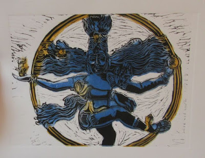Monoprint First -- On good paper, Pavel laid an acrylic sheet the size of the paper (9 x 12 in), and then ran them both through the press, to transfer the image onto the acrylic plate.  Note again, he did not transfer the image directly from an inked lino block  to the acrylic sheet.